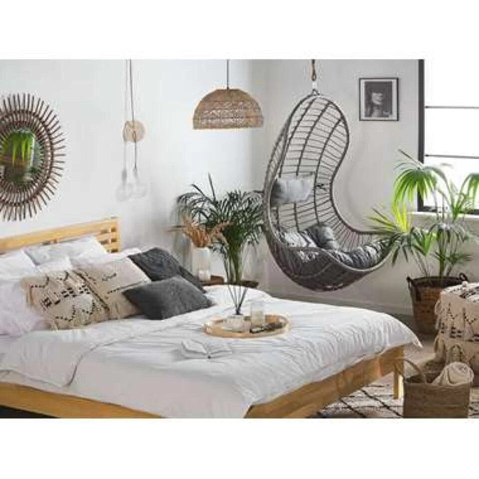Bohemian hangstoel met kussens. Deze rieten schommelstoel is ideaal voor liefhebbers van boho-stijl en liefhebbers van modern design. Monteer dit bijzondere meubelstuk in je woon- of slaapkamer en geniet dankzij twee zachte kussens van een uiterst comfortabele zitplek. Omdat de mand is gemaakt van stevig imitatierotan, kan de stoel ook buiten gebruikt worden. Creëer een gezellige leeshoek in je interieur of op het balkon.
