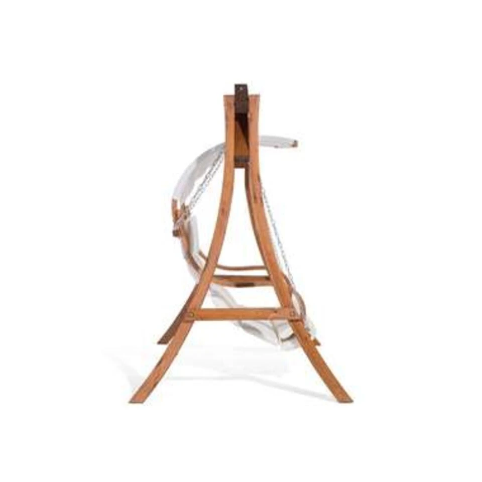 Romantische schommelbank van larikshout. Deze prachtige schommelbank zorgt voor een vakantiegevoel in je eigen tuin! Het romantische ontwerp is gecombineerd met praktisch gemak. Het frame is gemaakt van stevig, larikshout en staat erg stabiel. De warm-bruine teak-kleur past mooi bij de heldere, comfortabele beige polyester-bekleding van de zitting. Deze bekleding is eenvoudig te reinigen met een vochtige spons. Door het grote zonnedak wordt je beschermt tegen de felle zon en de wind. Je kunt het zonnedak erg gemakkelijk demonteren waardoor het wassen hiervan mogelijk is (max. 40°C in de wasmachine). De kettingen zijn gemaakt van massief staal.