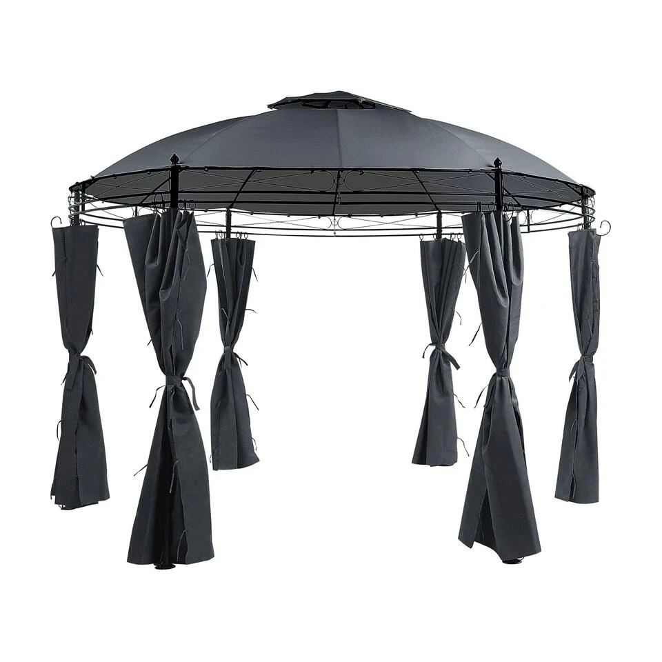 Modern tuinpaviljoen met gordijnen en overkapping. Wind, zon of regen? Dit tuinpaviljoen geef jou en je gasten een bijzonder mooi, schaduwrijk, water- en windbestendig toevluchtsoord. Het paviljoen sierlijke ornamenten, sierpoten en duurzame, Uv-bestendige dakbedekking. De robuuste polyester gordijnen kunnen van de palen worden losgemaakt en met de praktische riemen aan elkaar worden vastgemaakt. De betrouwbare, hoogwaardige staalconstructie, samen met robuuste haringen zorgen voor een optimale stabiliteit.
