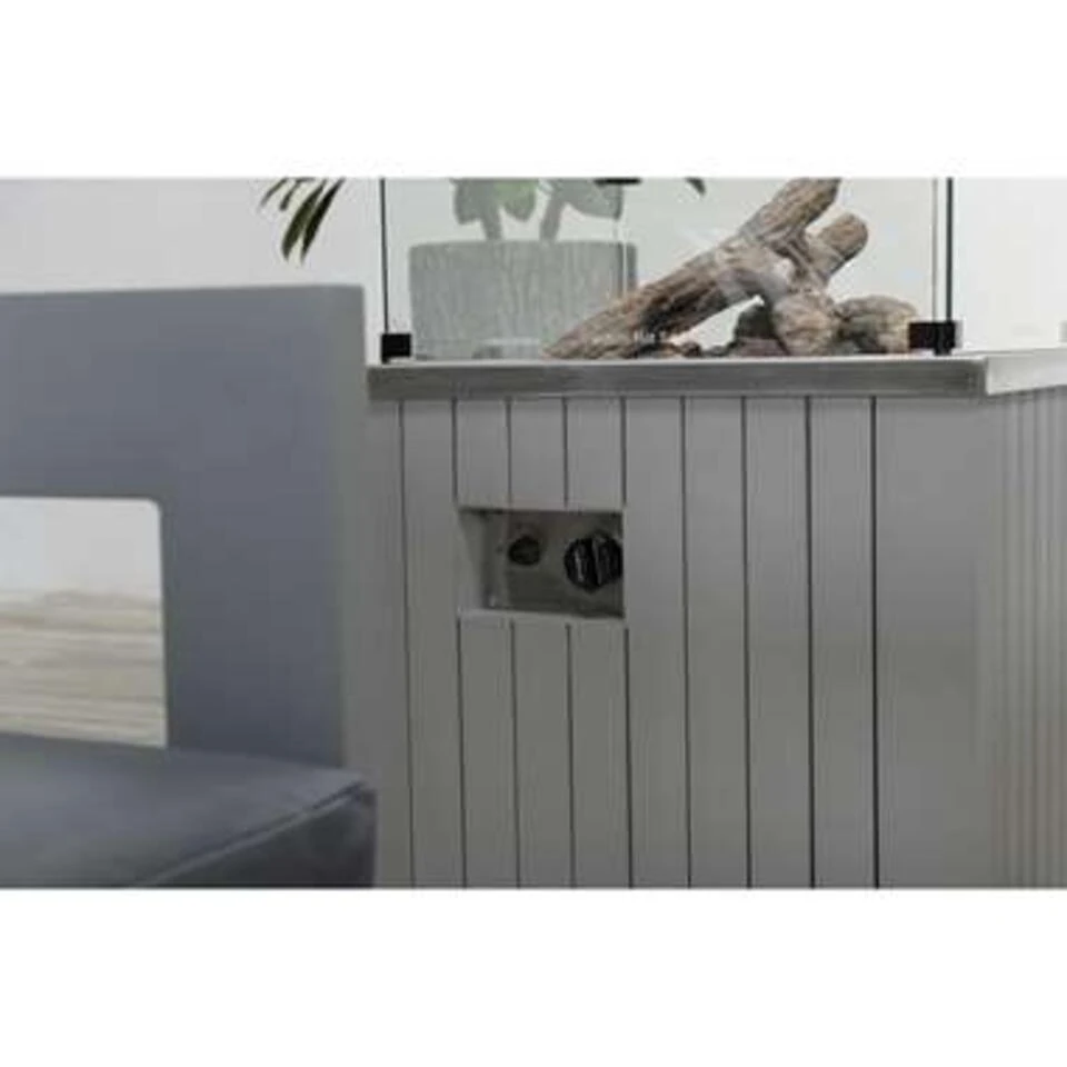 Zie jij jezelf ook al heerlijk genieten in je tuin met een sfeervolle gas vuurtafel? Met deze Cozy living Faro sfeerhaard zit je er gegarandeerd lekker warm bij. Met het grote voordeel dat je geen last hebt van rook of vonken. Deze Faro Cozy Living sfeerhaard 60×60 Arctic Grey cm is vervaardigd uit een onderhoudsvrije RVS brander en RVS topblad afgewerkt met weerbestendige kunststof planken. De RVS-brander wordt mooi weggewerkt door de meegeleverde lavastenen en vier houtblokken. Heb je kinderen en vind je de vlammen toch wat gevaarlijk? Dit is makkelijk op te lossen met een glazen vierkante ombouw. Let op: deze glazen ombouw wordt niet standaard meegeleverd en is los te bestellen. De Faro sfeerhaard heeft het voordeel dat de gasfles erin kan worden opgeborgen. Geen last van een gasslang of gasfles op je terras. Daarnaast is de gas vuurtafel gemakkelijk te ontsteken door middel van een elektrische ontsteking. De hoogte van de vlam is zelf in te stellen met een handige draaiknop. De ontsteking en draaiknop bevinden zich aan de zijkant van de lounge vuurtafel.