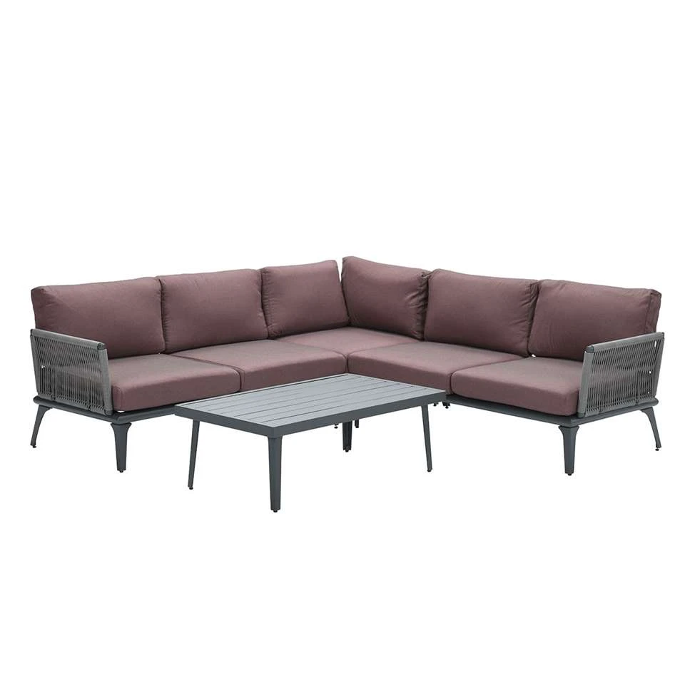 Deze complete loungeset is vervaardigd uit een weerbestendig en onderhoudsvrij frame van aluminium. Het frame is voorzien van een stevige donker grijze poedercoating. Dit frame heeft een mooie afwerking van textileen touw, dit touw heeft een diameter van 5 mm en een licht grijze kleur. Samen geeft dit met de meegeleverde kussens in een koperen kleur geeft dit een prachtig uiterlijk aan de loungeset. De Patricia loungeset wordt geleverd inclusief kussens. Deze luxe kussens zijn bewerkt met een coating zodat deze waterafstotend zijn. De kussens zijn dus niet waterdicht en dienen na gebruik opgeborgen te worden, bijvoorbeeld in de schuur of kussenbox, dit is vooral aan te raden wanneer er langdurig geen gebruik van de loungeset gemaakt gaat worden. Deze loungeset bestaat uit een hoekelement, twee loungebanken en een loungetafel.