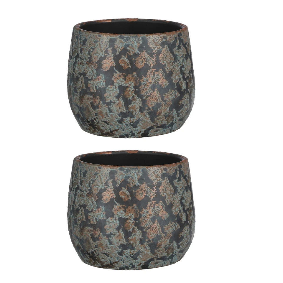 Bloempot keramiek voor kamerplant koper flakes print 15.5 x 19.5 cm. Deze ronde bloempot uit de Clemente serie met gemeleerd effect geeft een boost aan uw interieur. Gemaakt van terracotta/keramiek. Diameter: 19.5 cm. Hoogte: 15.5 cm.