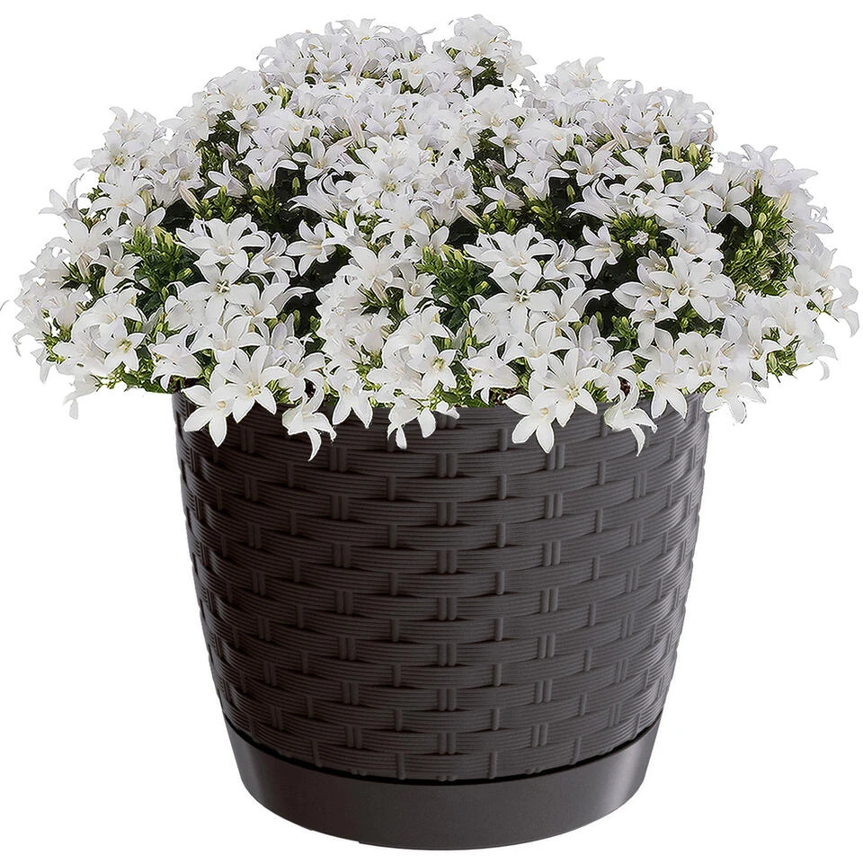 Ronde gevlochten plantenpot/bloempot kunststof dia 30 cm en hoogte 26 cm in het donkerbruin. Vorstbestendig ja. Basic Ratolla plantenpotten voor in huis, tuin, serre of op het balkon. De pot is voorzien van een water opvangbak.